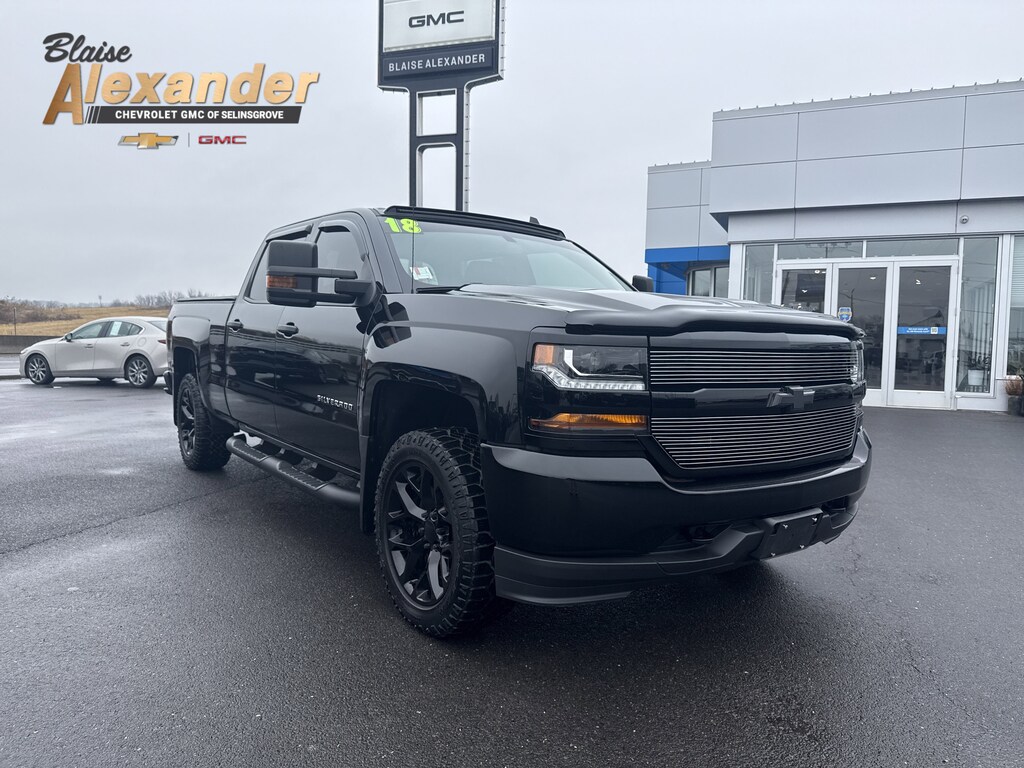 Black 2018 Chevrolet Silverado 1500 Custom 4WD 6-Speed Automatic Electronic with Overdrive EcoTec3 5.3L V8 4 WHEEL DRIVE/ALL WHEEL DRIVE, ONE OWNER, FRESH TRADE, SERVICED HERE, FREE LIFETIME STATE INSPECTIONS, ONLY AT BLAISE ALEXANDER CHEVY GMC OF SELINSGROVE, 6-Speed Automatic Electronic with Overdrive, 4WD, Dark Ash With Jet Black Interior Accents Cloth, 150 Amp Alternator, Air Conditioning, Black Power Adjustable Heated Outside Mirrors, Bluetooth® For Phone, Body Color Rear Bumper w/Cornersteps, Body-Color Grille Surround, Body-Color Headlamp Bezels, Chevrolet Connected Access, Chevrolet w/4G LTE, Color-Keyed Carpeting w/Rubberized Vinyl Floor Mats, Custom Convenience Package, Custom Value Package, Deep-Tinted Glass, Driver Information Center, Electric Rear-Window Defogger, Front & Rear Black Bow Tie, Front Body-Color Bumper, Front Frame-Mounted Black Recovery Hooks, Graphite-Colored Rubberized-Vinyl Floor Covering, Heavy-Duty Rear Locking Differential, Manual Tilt Wheel Steering Column, OnStar & Chevrolet Connected Services Capable, Power Windows w/Driver Express Up, Preferred Equipment Group 1CX, Premium audio system: Chevrolet MyLink, Rally 1 Edition, Rear 60/40 Folding Bench Seat (Folds Up), Remote Keyless Entry, Remote Locking Tailgate, Silverado Custom Trim, SiriusXM Satellite Radio, Spray-On Pickup Box Bed Liner, Trailering Package, Wheels: 20" x 9" Black-Painted Aluminum.